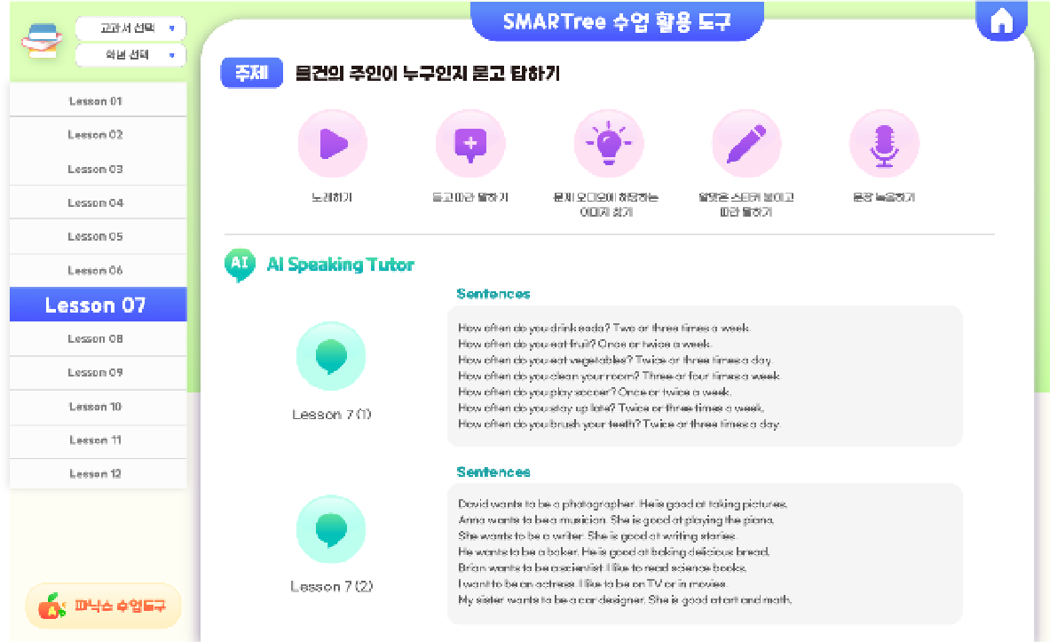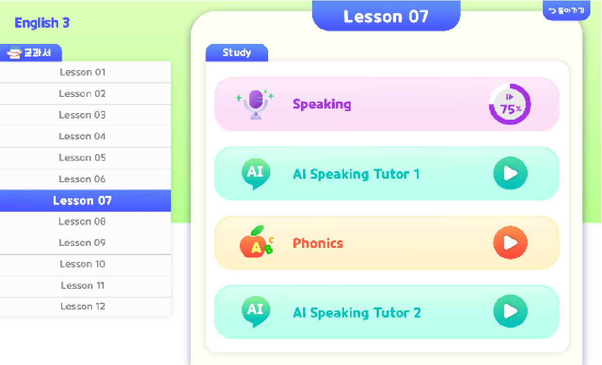 - 교과서 내용의 핵심문장과 어휘로 구성된 AI 스피킹 학습